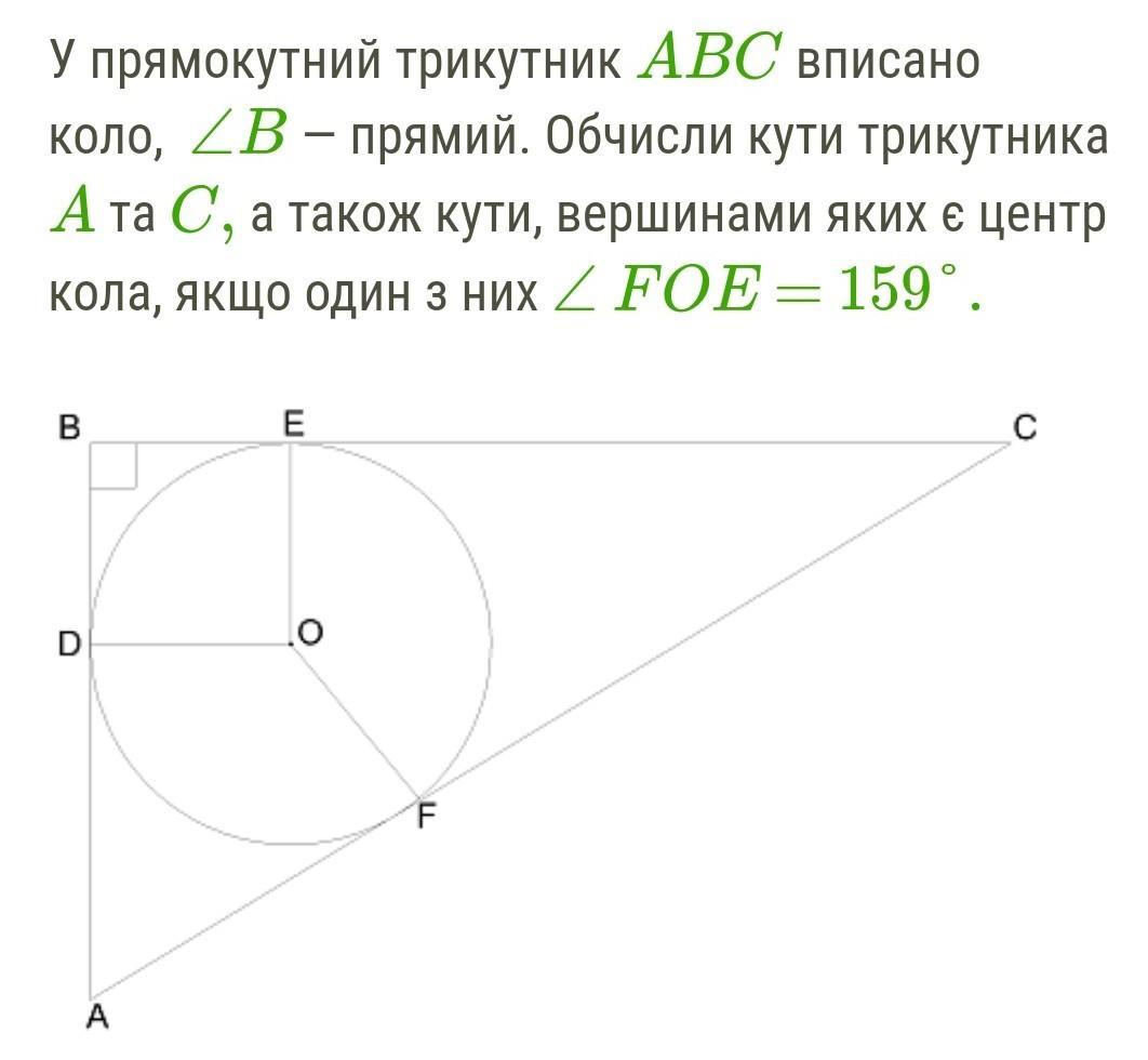 У прямокутний трикутник ABC вписано коло, ∠B — прямий. Обчисли кути трикутника A та C, а також кути, вершинами яких є центр кола, якщо один з них ∠ FOE = 159°.