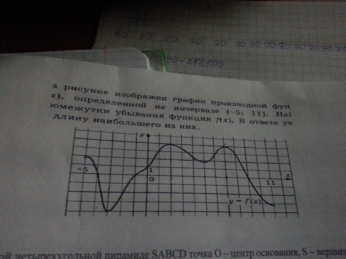 На рисунке изображен график функции f(x), определенной на интервале(-5;11).Найдите промежутки убывания функции f(x). В ответе укажите длину наибольшего из них.