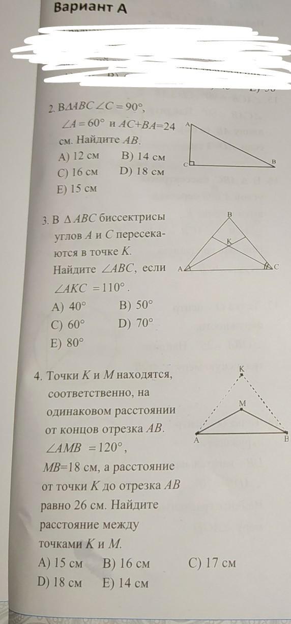 Пошаговое объяснение: 2) в треугольнике с 30,60,90 есть такое свойтво наименьший катет А(противолежит углу 30 ) а другой катет (протеволежит углу 60 )A а гипотенуза равна 2A так как сумма катета и гипотенузы равна 24 то A+2A=24 равна A=8 тогда AB=2A=16 3) исходя из того что A/2+C/2+110=180 тогда A/2+C/2=70 надо найти угол B вычтем из 360-110=250 так как 250+A/2+C/2+B=360 B=110-70=40 4) опустим высота ME на AB так как высота опущенная на основание ра-нного треугольника и биссектриса и медиана то мы получим треугольник с углами 30,60,90 градусов свойство я уже написал с помощью мы найдем ME =9 и так как ME+MK=26 то MK=17