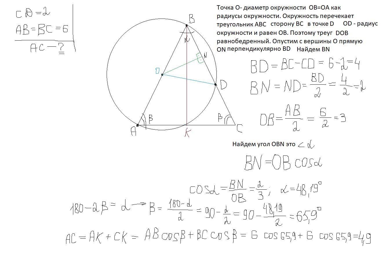 На стороне АВ треунольникаАВС как на диаметре построена окружность, пересекающая сторону ВС в точке D. Найдите АС, если известно, что CD=2, АB=ВС=6.