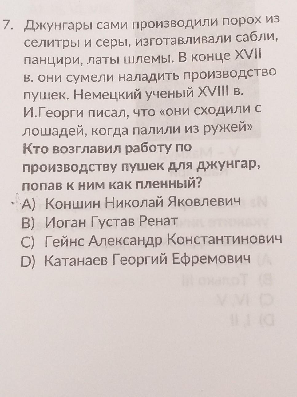 7. Джунгары сами производили порох из селитры и серы, изготавливали сабли, панцири, латы шлемы. В конце ХVII В. Они сумели наладить производство пушек. Немецкий ученый XVII в. И.Георги писал, что «они сходили с лошадей, когда палили из ружей» Кто возглавил работу по производству пушек для джунгар, попав к ним как пленный? -А) Коншин Николай Яковлевич B) Иоган Густав Ренат C) Гейнс Александр Константинович D) Катанаев Гeоргий Ефремович