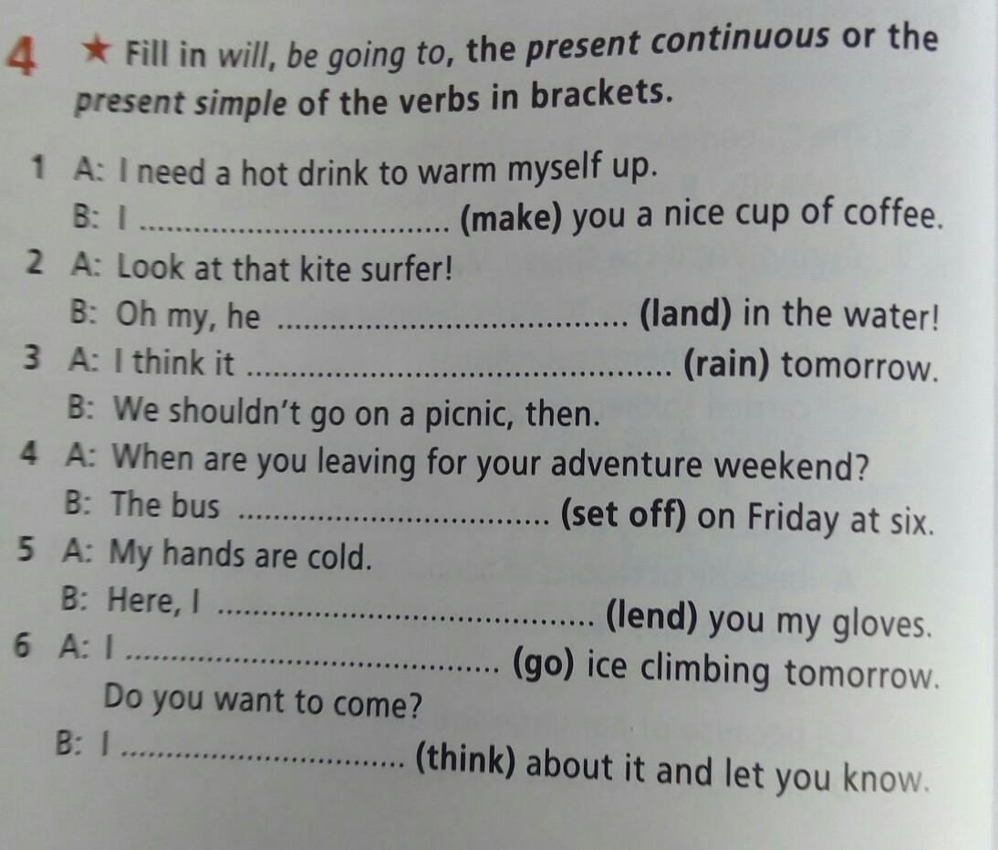 Fill in will, be going to, the present continuous or the present simple of the verbs in brackets.