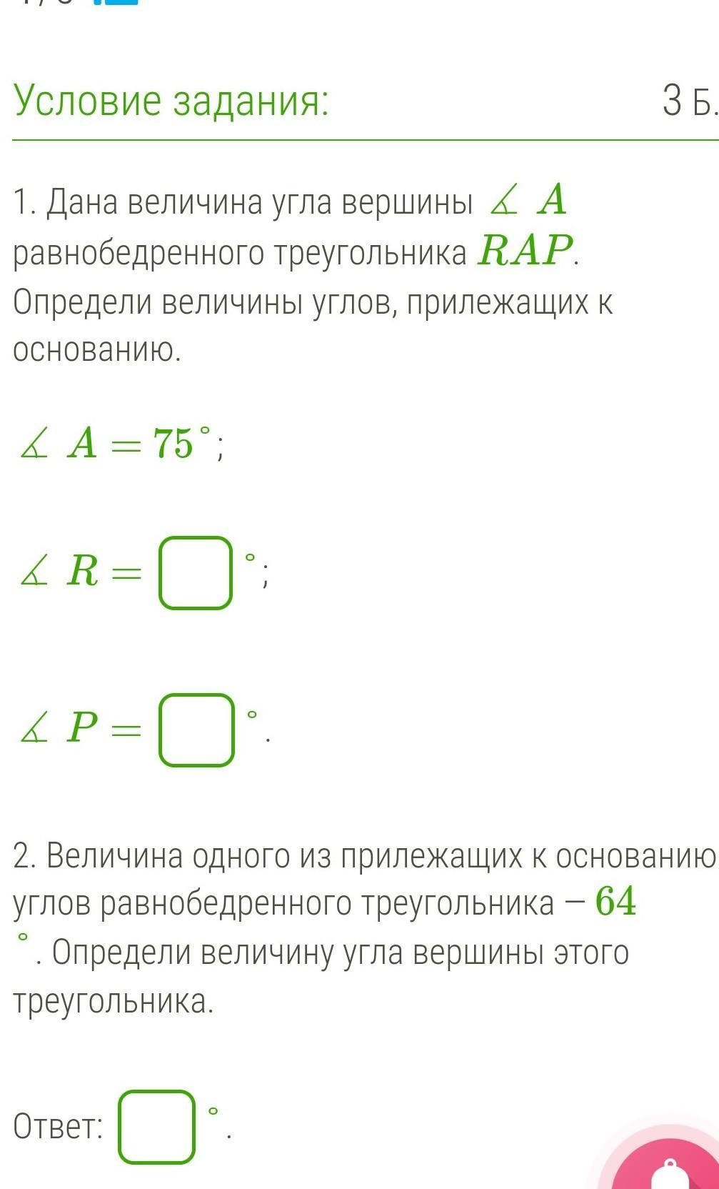 1) Сумма углов в треуоольнике ровна 180 значит 180-75 = 105 т,к углы при основании равны 105:2=52,5