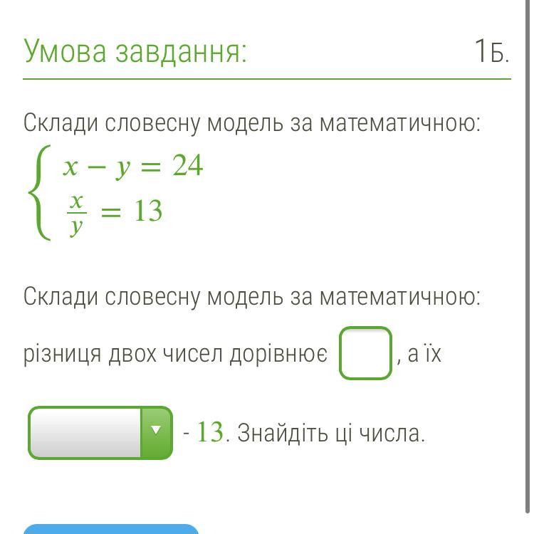 Склади словесну модель за математичною: різниця двох чисел дорівнює [], а їх - 13. Знайдіть ці числа.