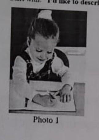 На фотографії маленька дівчинка, що робить завдання. Дівчинка одягнена у сарафан. Волосся зав'язано у високий хвіст