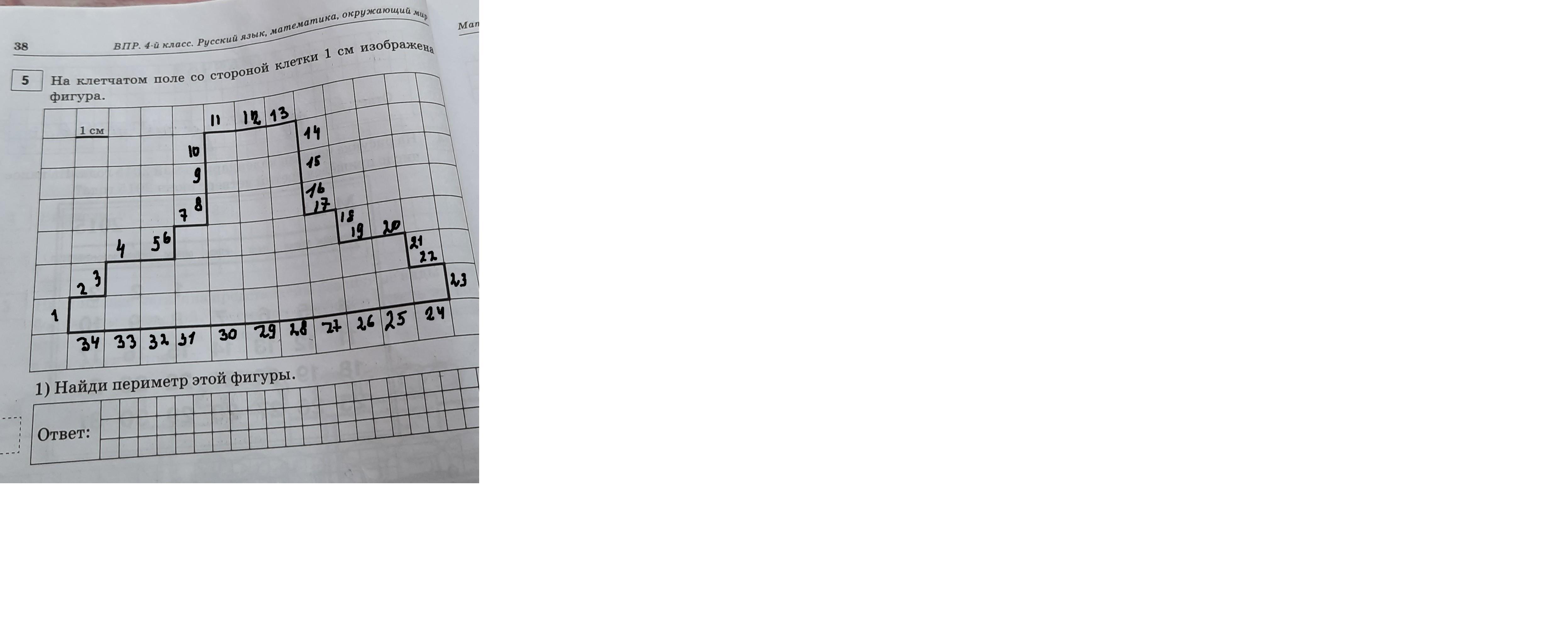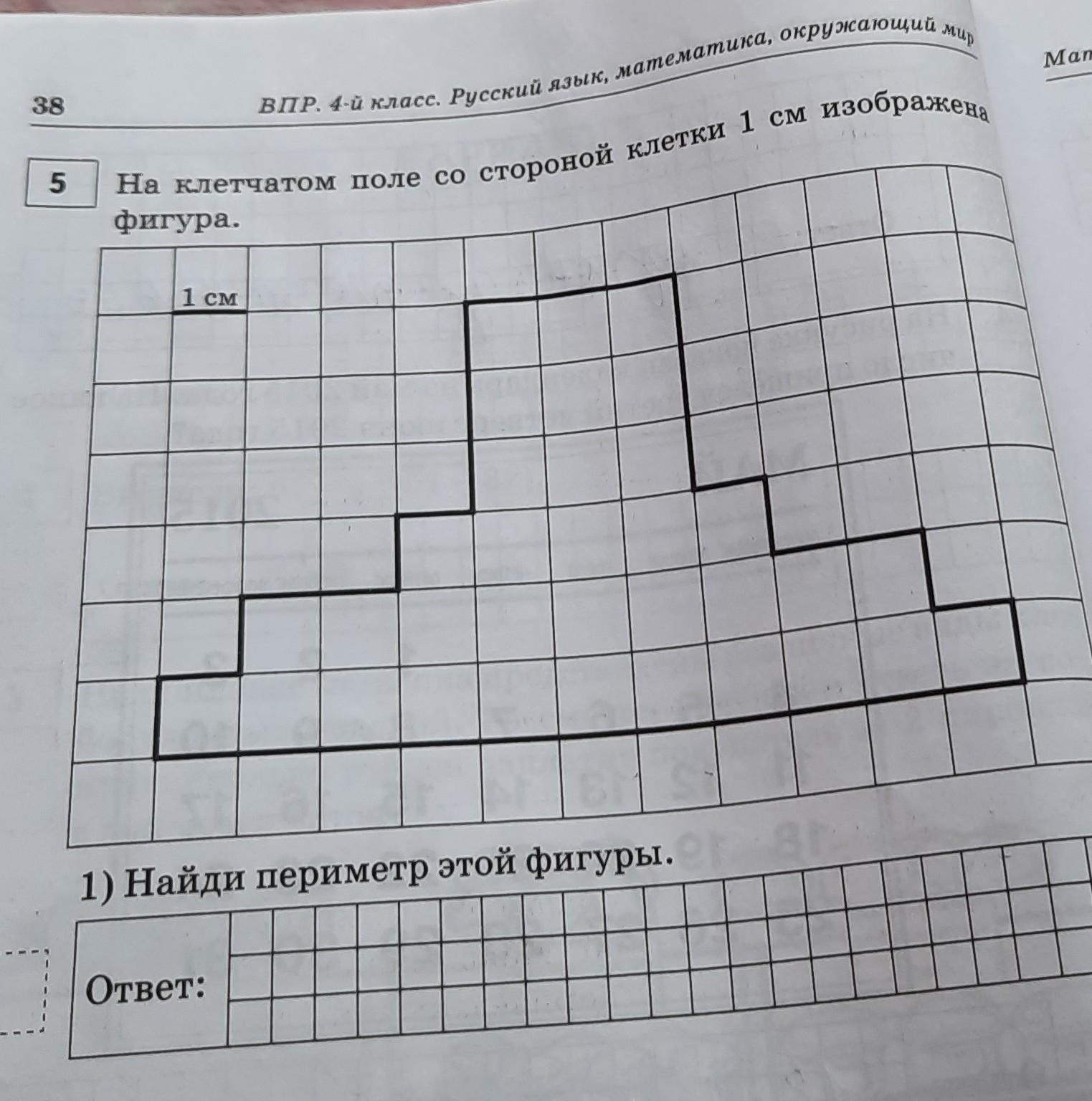 надо просто посчитать количество клеточек.Их 34.т.к длина 1 клеточки 1 см,то тогда периметр равен 34 см.