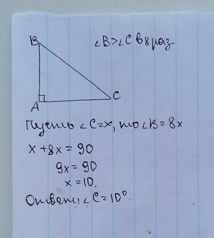 Один из острых углов прямоугольного треугольника в 8 раз больше другого. Найдите углы треугольника