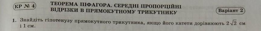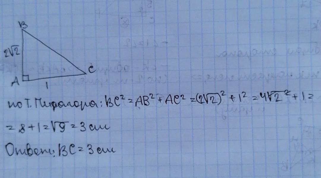 с=√(а²+b²)=√(1²+(2√2)²)=√(1+8)=√9=3 см