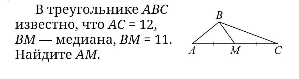 Поскольку ВМ - медиана, то она делит сторону АС на два равных отрезка. АМ=1/2*АС=6