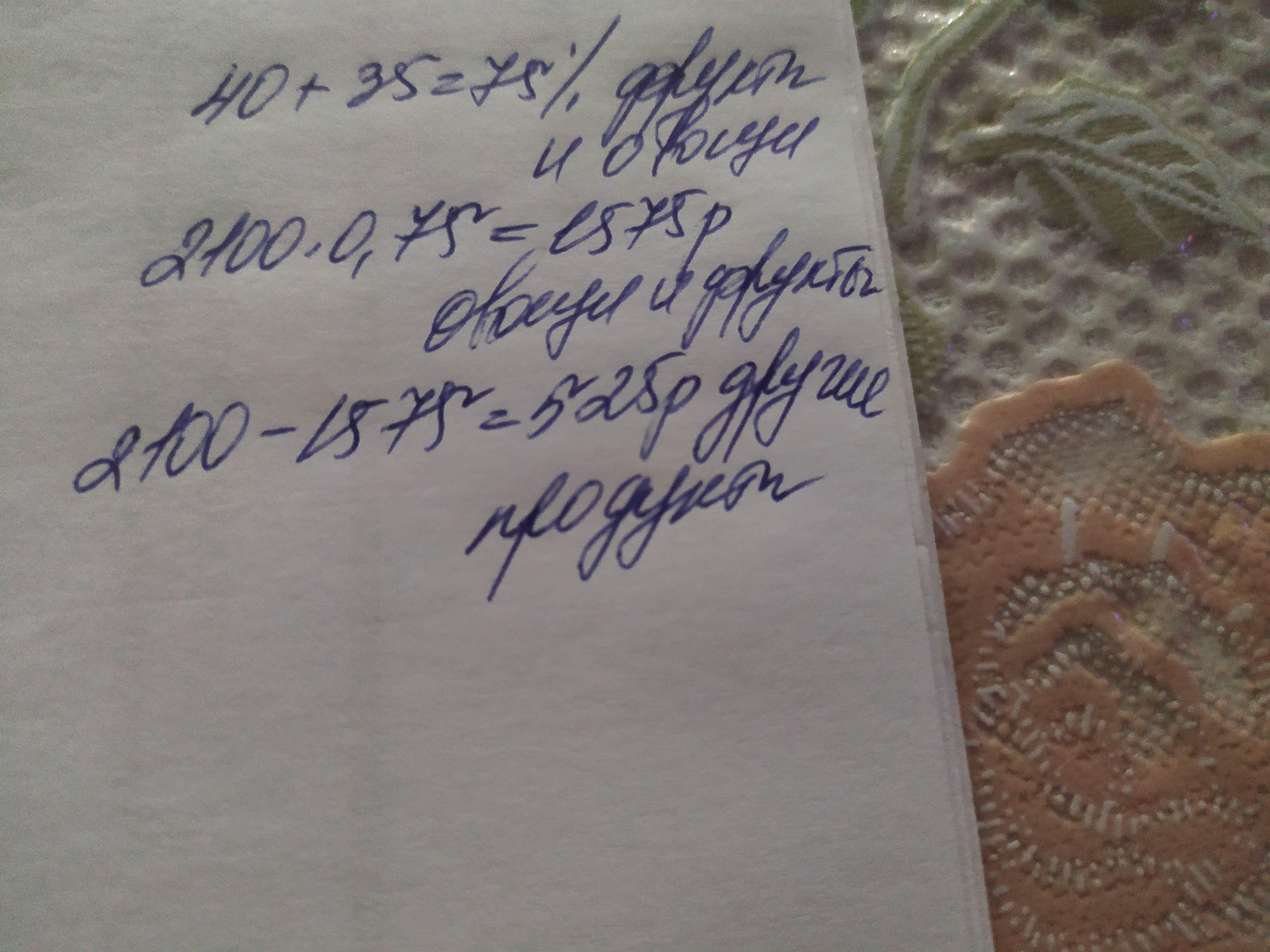 Оля купила в магазине продукты на сумму 2100 рублей.Причем на овощи она потратила 40% этой суммы , а на фрукты 35%. Сколько рублей потратила Оля на покупку других продуктов?