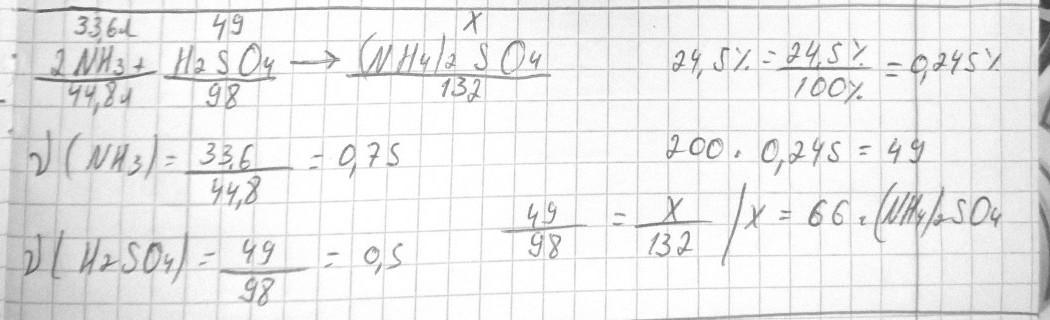 Для получения сульфата аммония аммиак объёмом 33,6 л был пропущен через 24,5 -процентный раствор серной кислоты массой 200г. Рассчитайте массу полученного сульфата аммония.