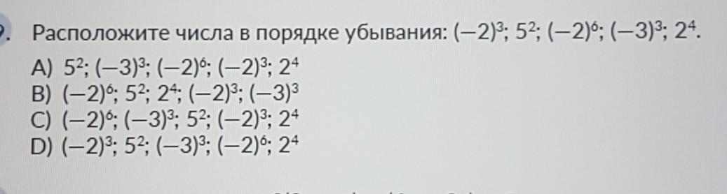 19. Расположите числа в порядке убывания: (-2)3; 5; (-2)°; (-3)3; 24.