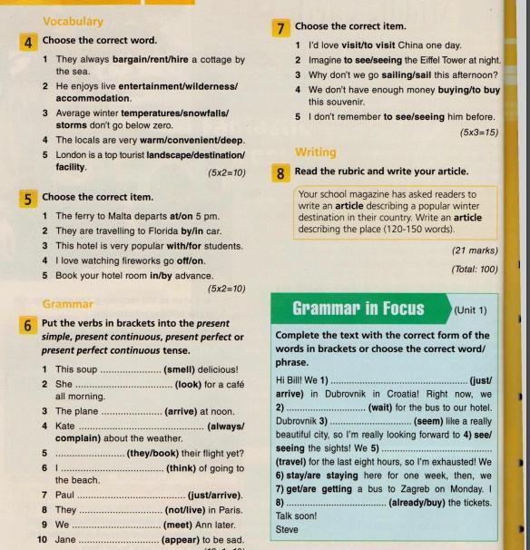 1 rent 2entertainment 3 snowfalls 4 convenient 5 landscape Ex5 1 at 2 by 3 for 4 off 5 in Ex6 1smells 2 has been looking for 3 arrives 4 is always complaining 5 have they booked 6 im thinking of 7 has just arrived 8 dont live 9we are meeting 10 appears Ex7 1 to visit 2 seeing 3 sailing 4to buy 5 seeing.