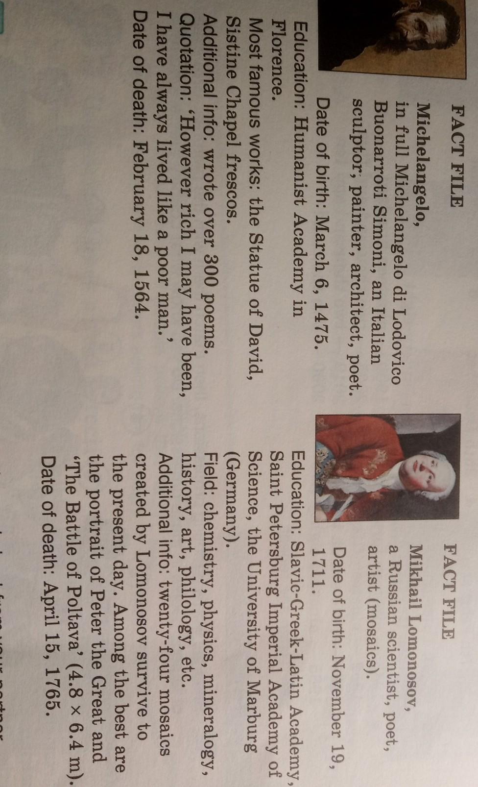 Самые известные работы: Статуя Давида, фрески Сикстинской капеллы. Дополнительная информация: написал более 300 стихотворений. Цитата: "Каким бы богатым я ни был, я всегда жил как бедняк. Дата смерти: 18 февраля 1564 года.