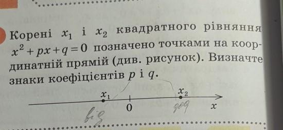1) x1<0, x2>0 => произведение x1*x2<0. Значит q имеет знак "-"
