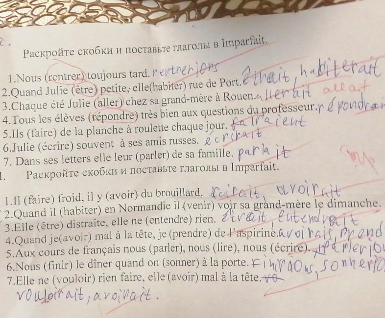 1. Faisait, avait 2. Habitait, venait 3. était, n’entendait 4. J’avais, prenais 5. Parlions, lisions, écrivions 6. Finissions, sonnait 7. Voulait, avait