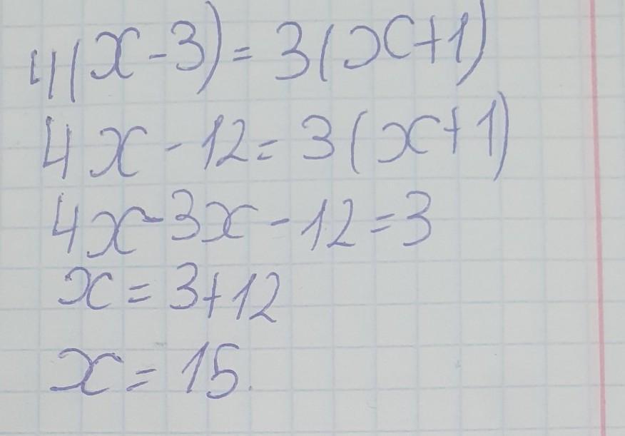 4x-12=3x+3 (умножили каждый член в скобках на 4 и на 3)
