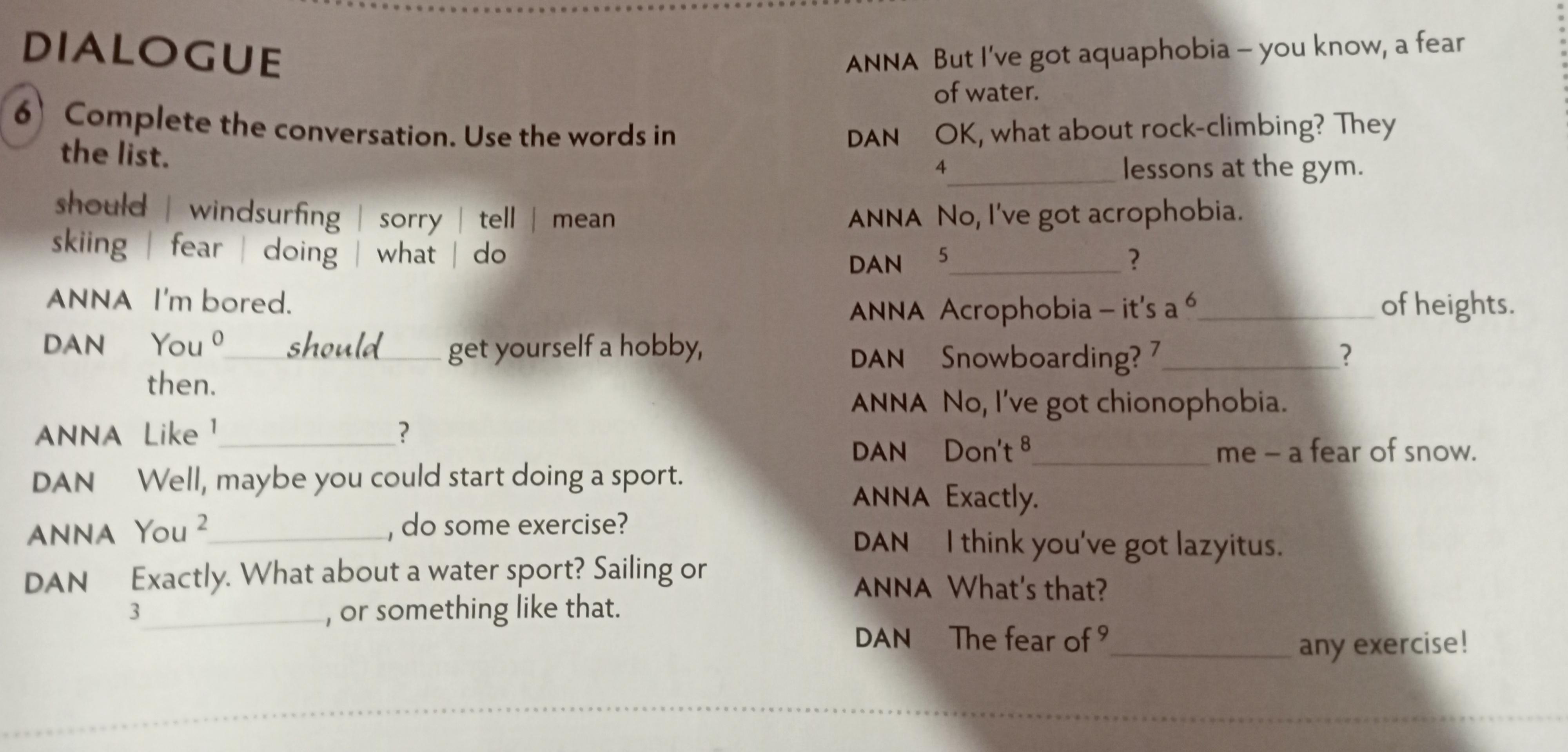 1) What 2) Mean 3) Windsurfing 4) Do 5) Sorry 6) Fear 7) Skiing 8) Tell 9) Doing
