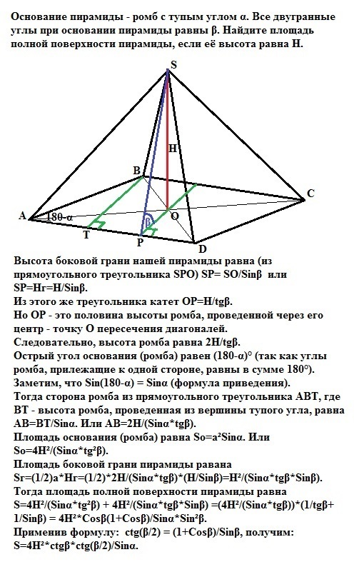 Основание пирамиды - ромб с тупым углом α. Все двугранные углы при основании пирамиды равны β. Найдите площать полной поверхности пирамиды, если её высота равна H.
