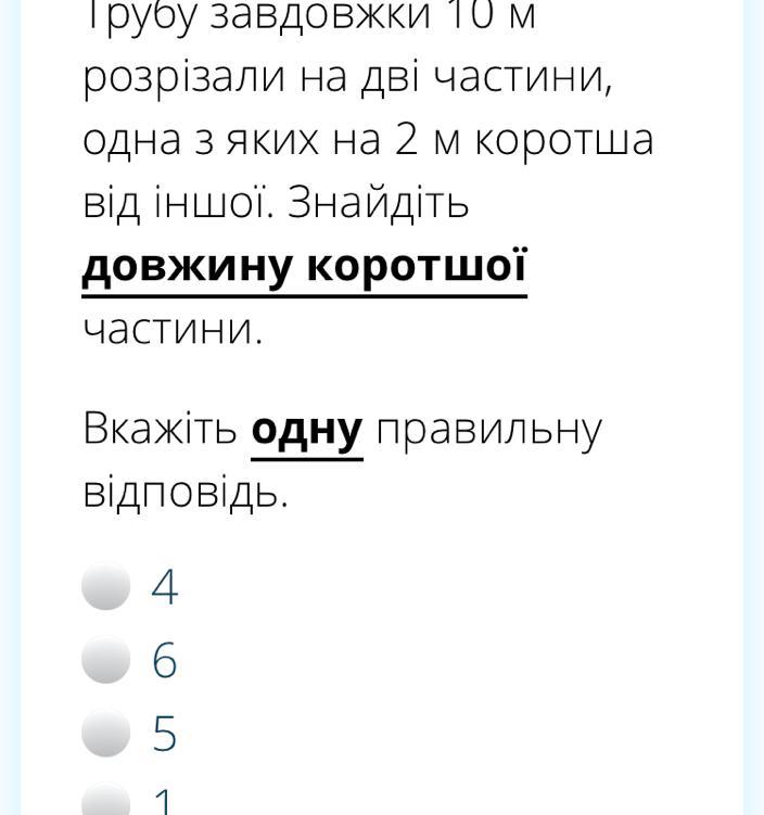 Відповідь:Нехай 1 труба х, тоді друга х-2. Загальна довжина х+(х-2) або 10м х+х-2=10 2х=12 х=6 м Короша 6-2=4м