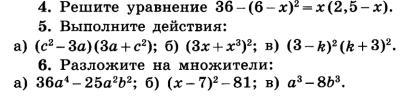 4. х=0; 5. а) с^4-9а^2; б) 9х^2+6х^4+х^6; в) к^4-18к^2+81; 6. а^2(6а-5b)(6а+5b); б) (х-16)(х+2); в) (a-2ab)(a^2+ab+4b^2)