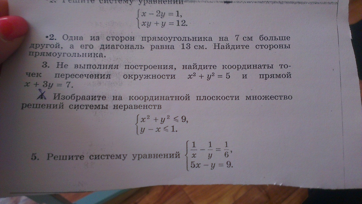 2) Диагональ делит прямоугольник на 2 прямоугольных треугольника. Поэтому получаем прямоугольный треугольник со сторонами (х) и (х+7), а диагональ равна 13см. По теореме Пифагора 13^2=х^2+(x+7)^2; 169=x^2+x^2+14x+49; 2x^2+14x-120=0; x^2+7x-60=0; D=49+240=289; x1= (-7+17)/2 = 5; x2= (-7-17)/2 =-12. Второй корень не имеет смысла, поэтому сторона прямоугольника х=5см, вторая сторона х+7=5+7=12см.