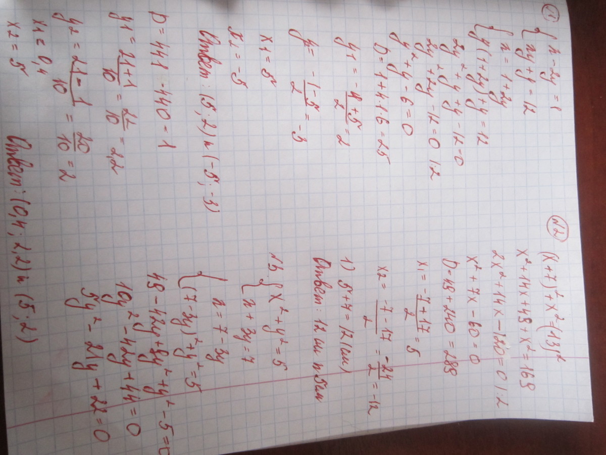 (7-3y)^2+y^2=5; 49-42y+10y^2=5; 10y^2-42y+44=0; 5y^2-21y+22=0; D=441-440=1.