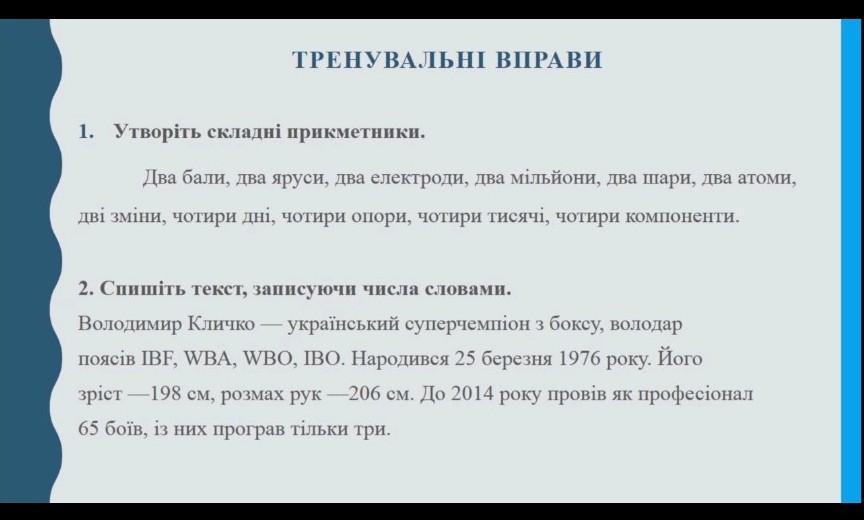 1.Двобаловий, двоярусний, двоелектродний, двомільйонний, двошаровий, двоатомний, двозмінний, чотириденний, чотироопорний, чотиротисячний, чотирокомпонентний.