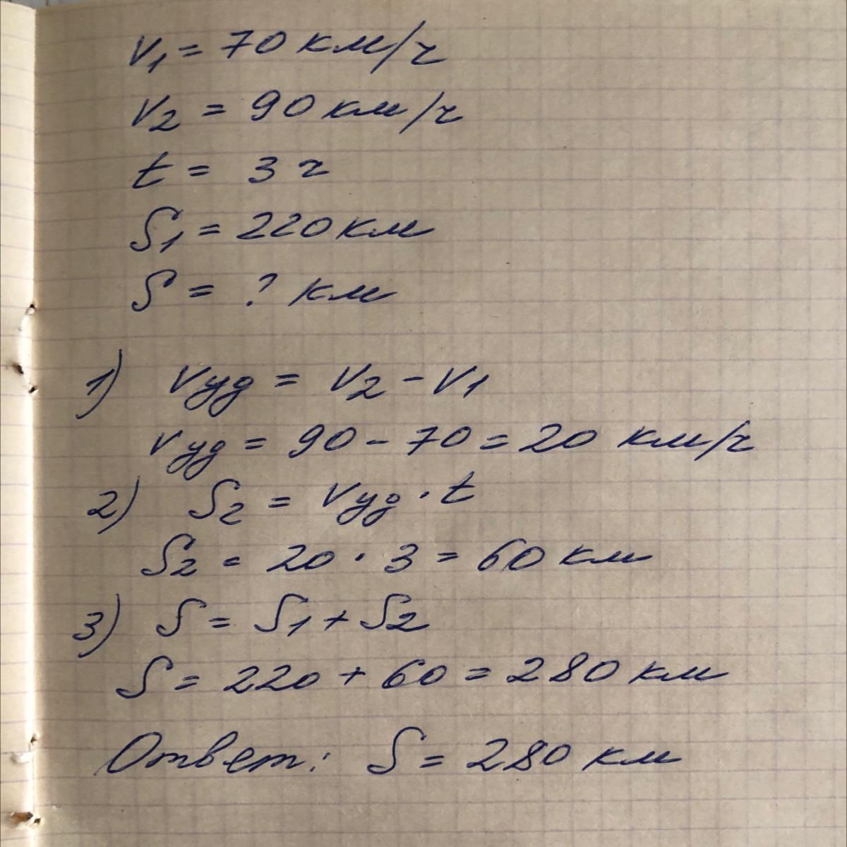 Мотоциклист выехал из пункта А в пункт В со скоростью 90км/ч. Через 3 часа, когда мотоциклист проехал 220 км после начала движения Из пункта А в том же направлении выехала машина и ехала со скоростью 70 км/ч. Какое расстаяние будет у мотоциклиста когда он проедет ещё 5 часов? Какое расстояние будет у велосепидиста расстаяние через 5 часов после начала движения мотоциклиста?