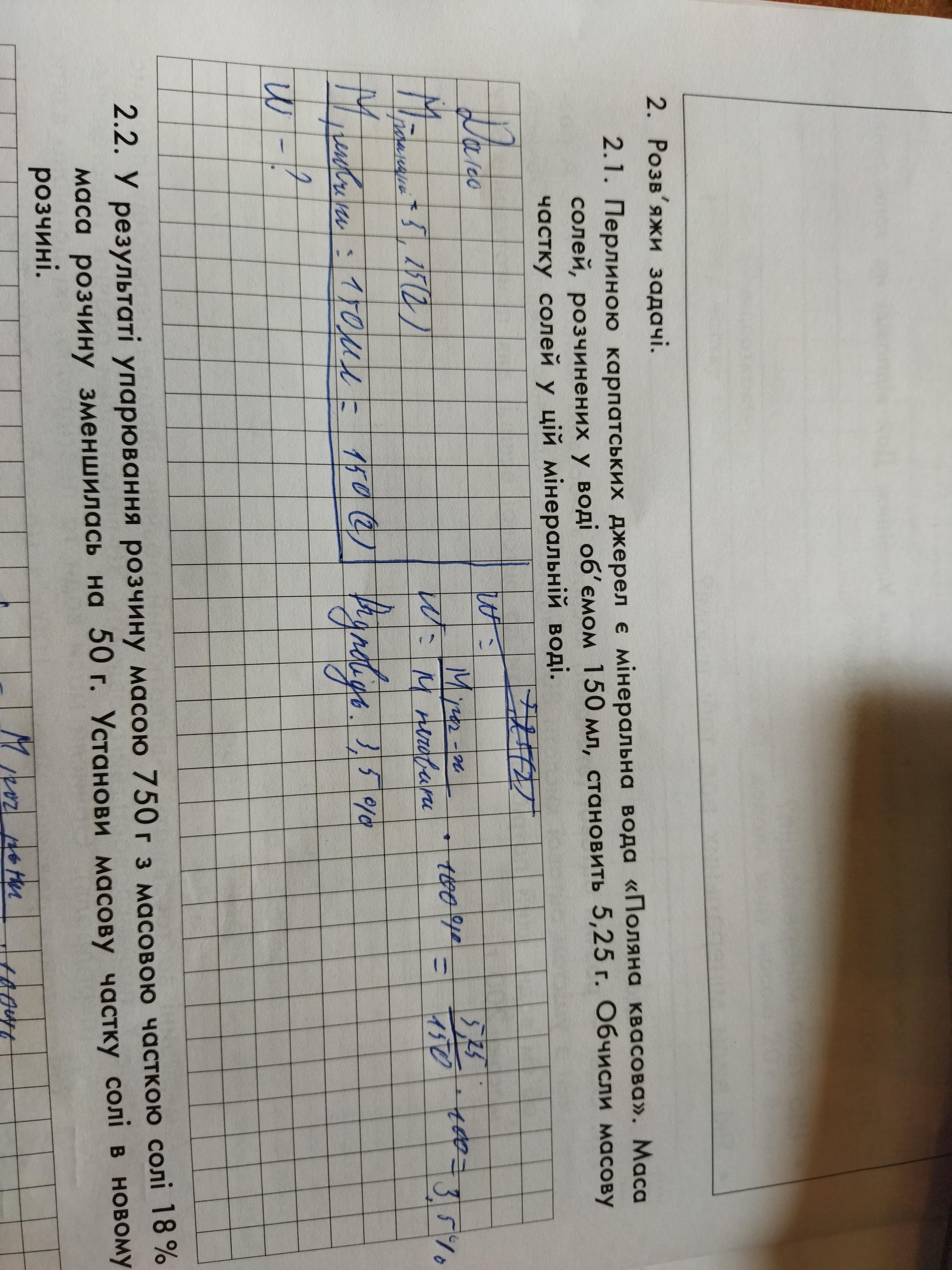 солей, розчинених у воді об'ємом 150 мл, становить 5,25 г. Обчисли масову