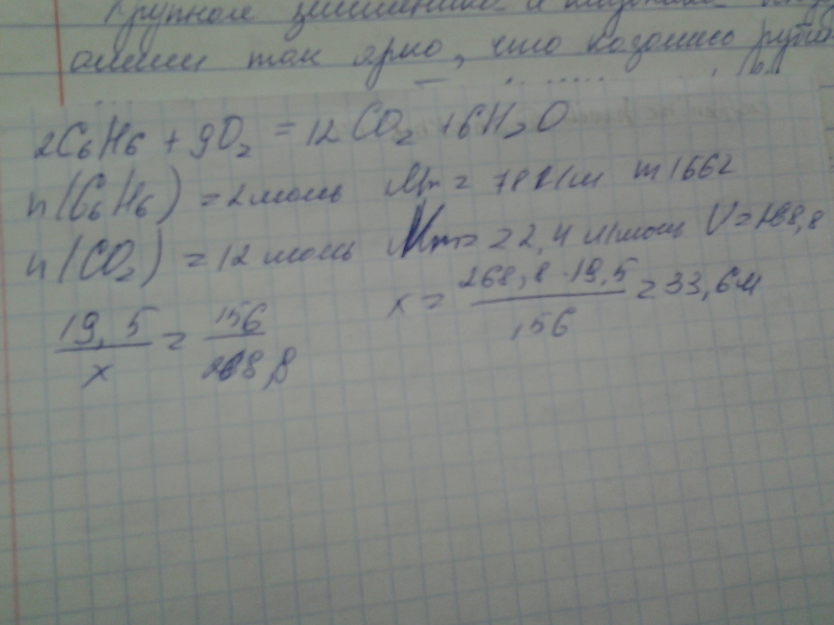 Объем (н.у) оксида углерода (IV),образуещегося пр сгорании 19.5 г бензола,равен: