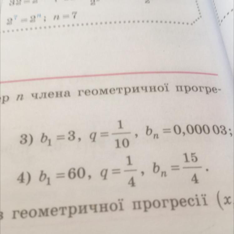 3) b₁=3; q=1/10; bₙ=0,00003: (1/10)ⁿ⁻¹=0,00003/3=(3·10⁻⁵)/3=(1/10)⁵; n-1=5; n=5+1=6