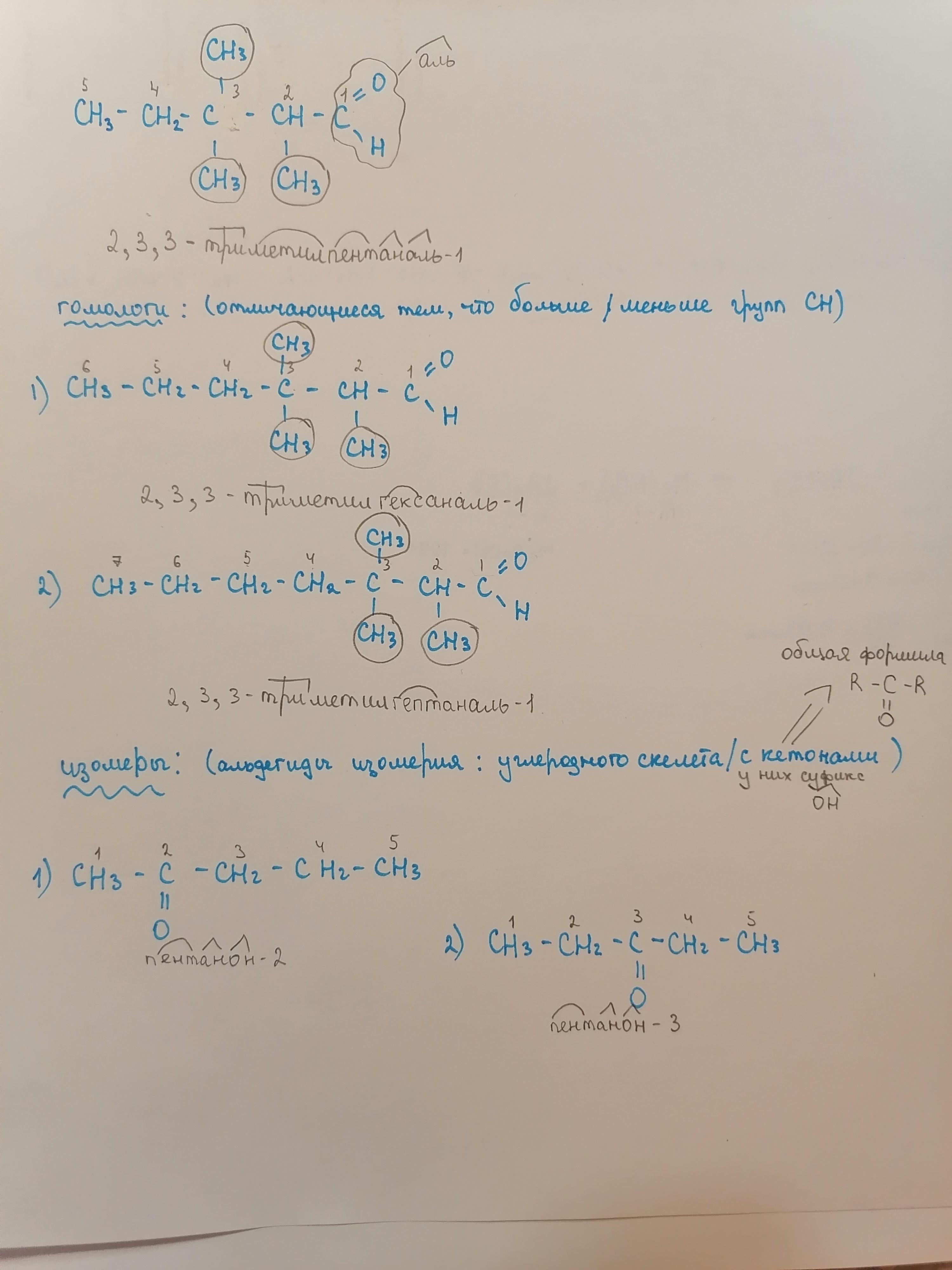 напишите структурные формулы двух гомологов и двух изомеров: 2,3,3- триметилпентаналь