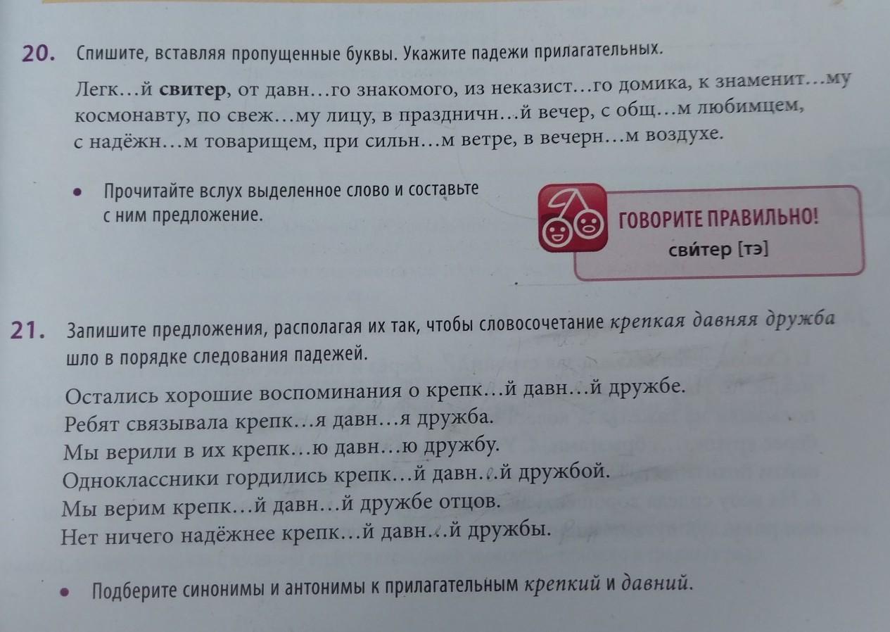 Лёгкий (И.п) свитер, от давнего (Р.п) знакомого, из неказистого (Р.п.) домика, к знаменитому (Д.п.) космонавту, по свежему (Д.п.) лицу, в праздничный (В.п.) вечер, с общим (Т.п.) любимцем, с надёжным (Т.п.) товарищем, при сильном (П.п.) ветре, в вечернем (П.п.) воздухе.
