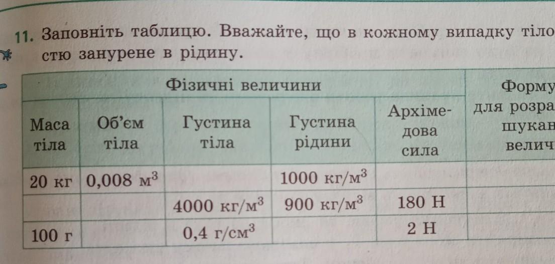 11. Заповніть таблицю. Вважайте, що в кожному випадку тіло повні-