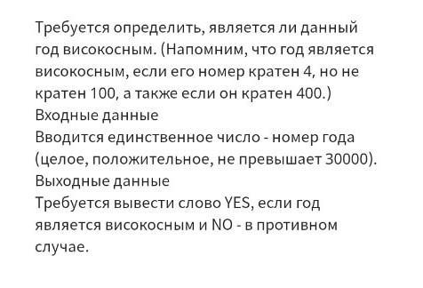 if ((year mod 4 = 0) and (year mod 100 <> 0)) or (year mod 400 = 0) then write('YES') else write('NO')