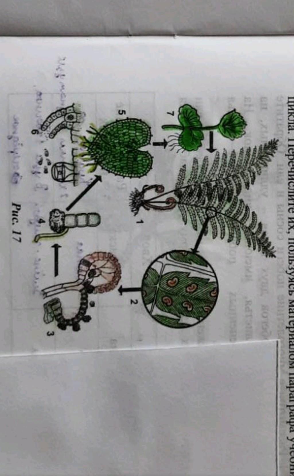 Ответ: 1 папоротник, взрослое растение спорофит. 2- лист с сорусами. 3- созревший спорангий, высыпание спор 4- прорастающая спора. 5- заросток - гаметофит 6- архегоний с яйцеклеткой . 7 - молодой спорофит