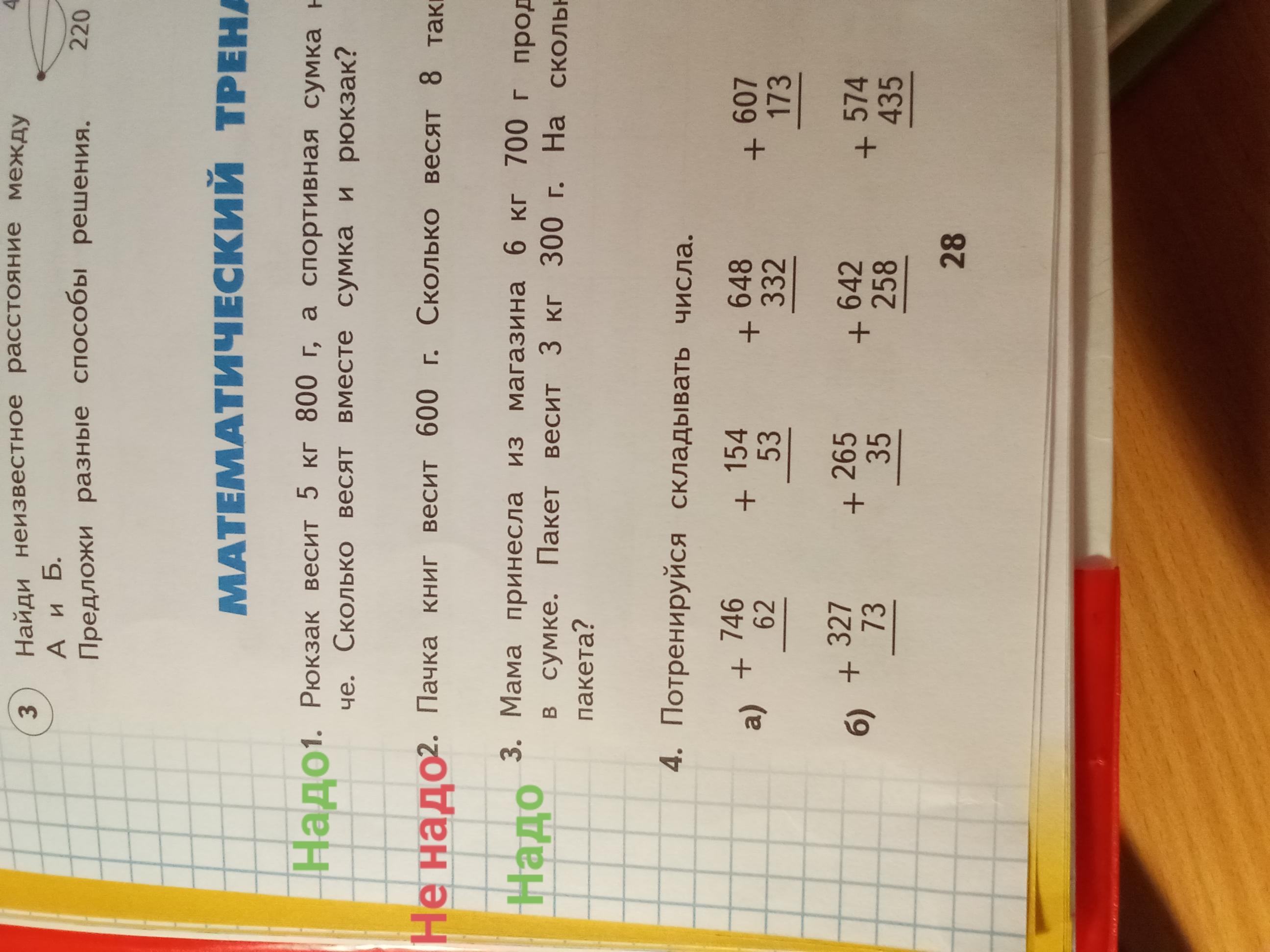 1 задание Рюкзак весит 5 кг 800 г а спортивная сумка на 2 кг легче. Сколько весят вместе сумка и рюкзак?