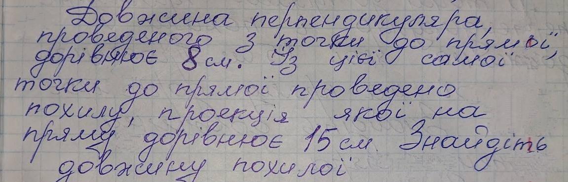 Перпендикуляр АС= 8 см, проекция ВС= 15 см и наклонная образуют " египетский треугольник". Воспользуемся теоремой Пифагора АВ^2=АС^2+ВС^2= 8^2+15^2=64+225=289