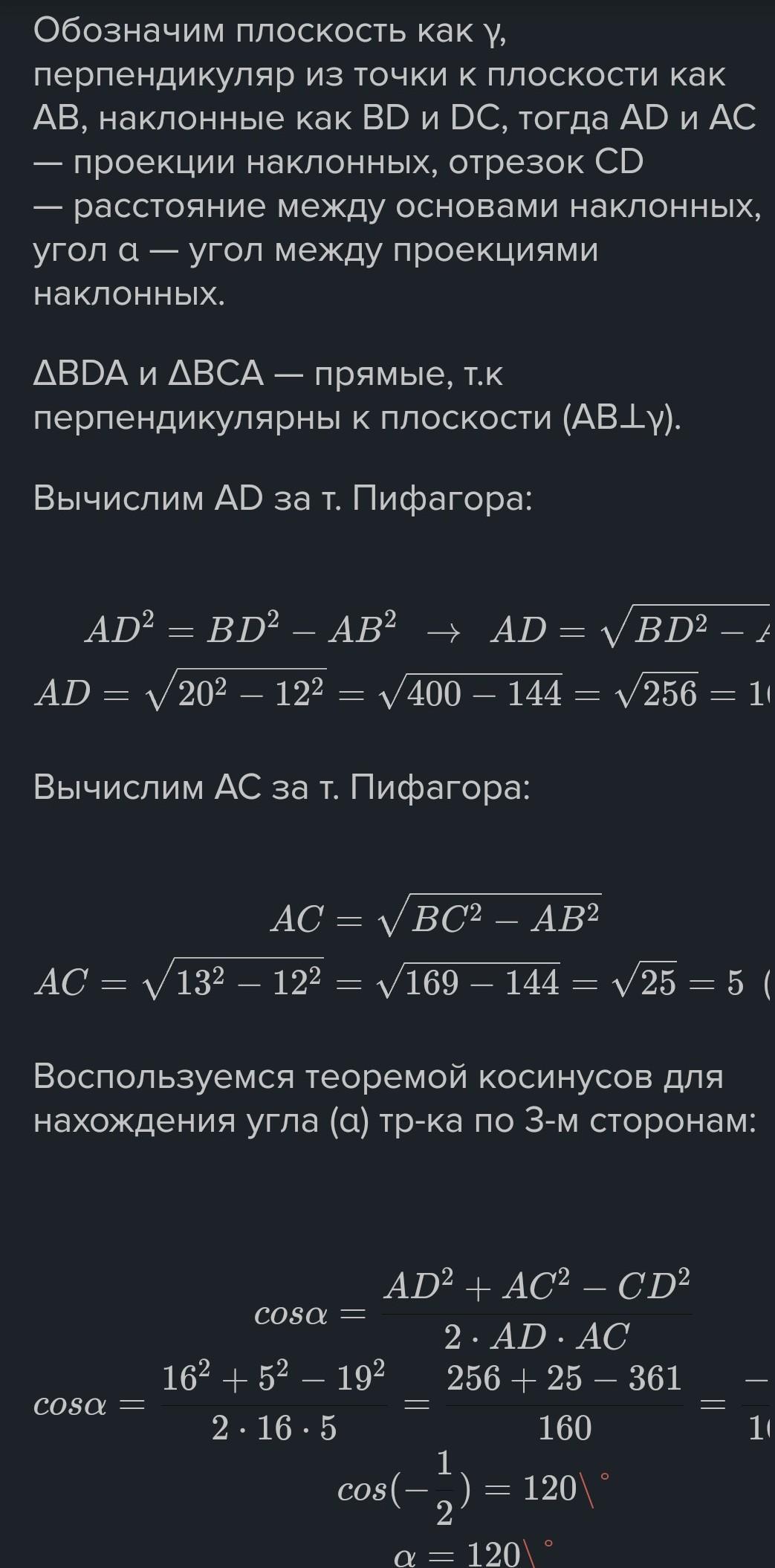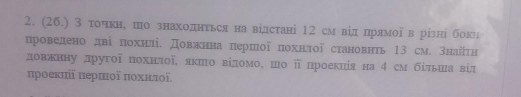 з точки що знаходиться на відстані 12 см від прямої в різні боки проведено дві похилі. довжина першої похилої становить 13см. Знайти довжину другої похилої, якщо відомо, що її проекція на 4см більша від проекції першої похилої