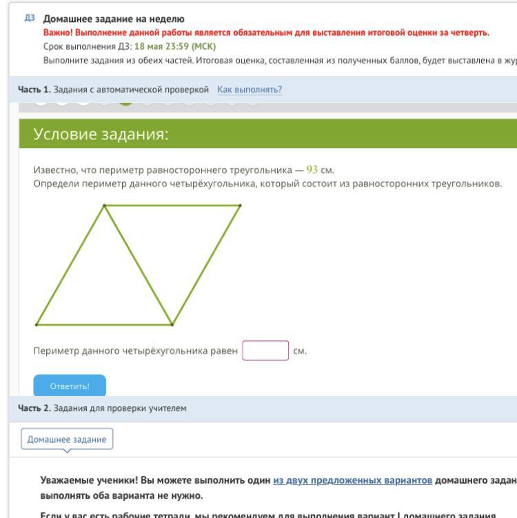Р=3*а → а=Р:3=93:3=31(см)- длина одной стороны