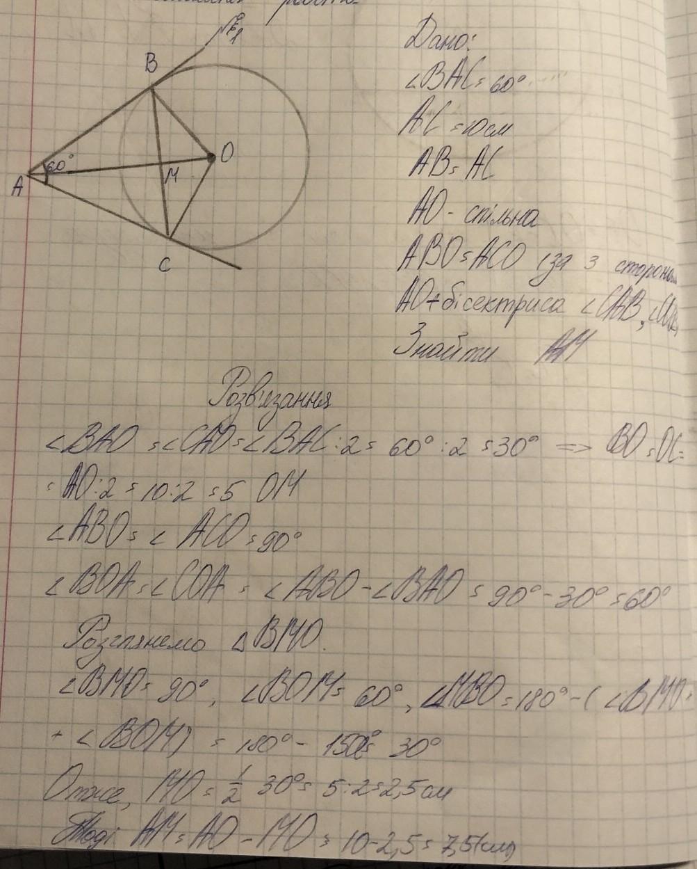 З точки A до кола проведено дотичні AB і AC (B і C - точки дотику). Знайдіть AM, якщо ∠BAC = 60°, AO = 10 см.