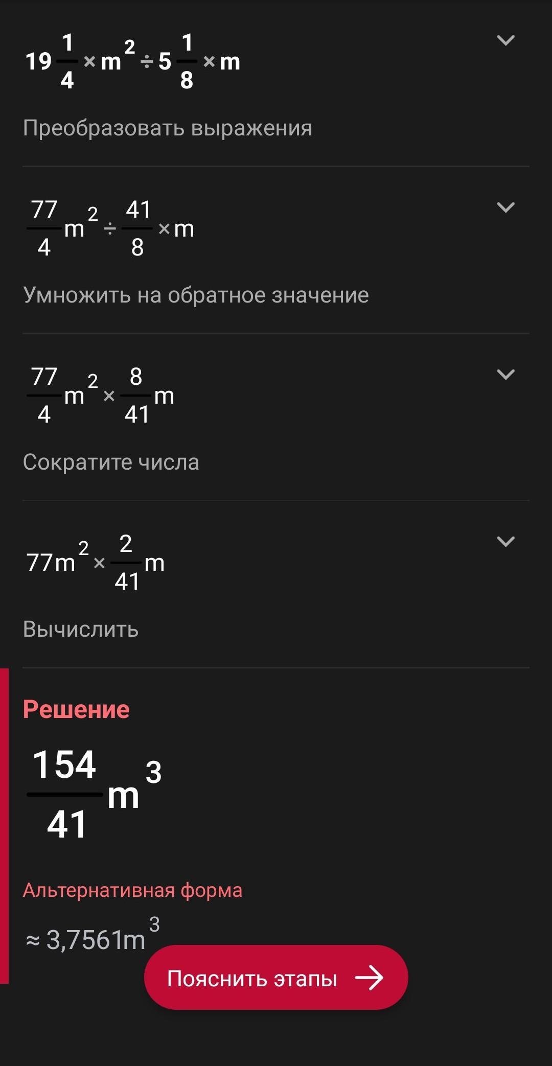 19 1/4 м2 : 5 1/2 м2= 77/4 м2 : 11/2 м2(переводим в неправильные дроби)= 77/4 м2 • 2/11 м2 (заменяем деление умножением и переворачиваем дробь)= 7/2 м2 • 1 м2 (сокращаем) = 7/2 м2= 3 1/2