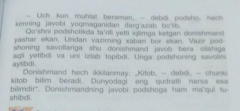 Царь сказал: «Я дам тебе три дня». В соседнем королевстве жил мудрец, определение которого было семь иглимов. Министр об этом знал. Министр понял, что этот мудрец может ответить на вопросы царя, и разыскал его. Он сказал ему вопрос короля. Мудрец без колебаний сказал: «Книга», потому что книга учит. И самая могущественная вещь в мире - это знание ». Ответ мудрого человека тоже понравился царю.