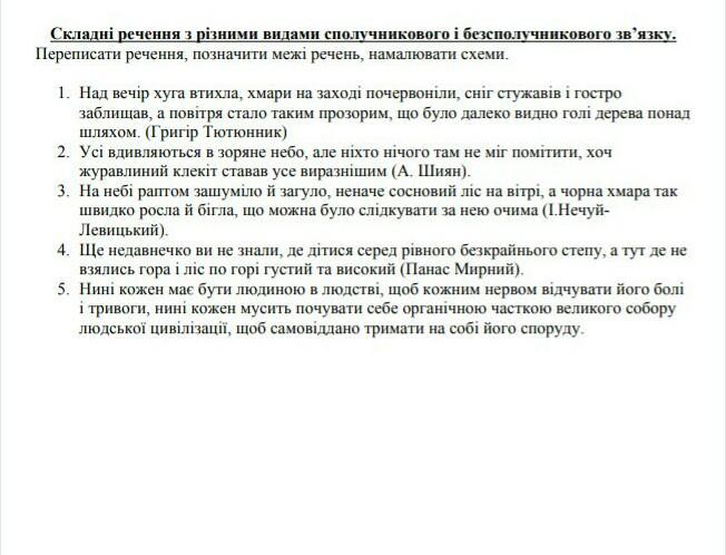 1. (1) Над вечір хуга втихла, (2) хмари на заході почервоніли, (3) сніг стужавів і гостро заблищав, (4) а повітря стало таким прозорим, (5) що було далеко видно голі дерева понад шляхом.