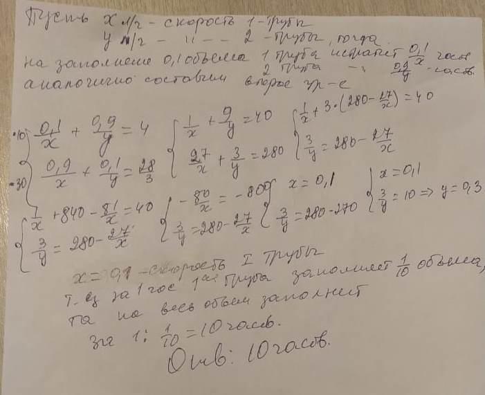 Если 0,1 бассейна наполнит первая труба, а затем 0,9 - вторая, то бассейн будет наполнен за 4 часа. Если же 0,9 бассейна наполнит первая труба, а затем 0,1 - вторая, то бассейн будет наполнен за 9ч 20мин. За какое время наполнит бассейн одна первая труба?