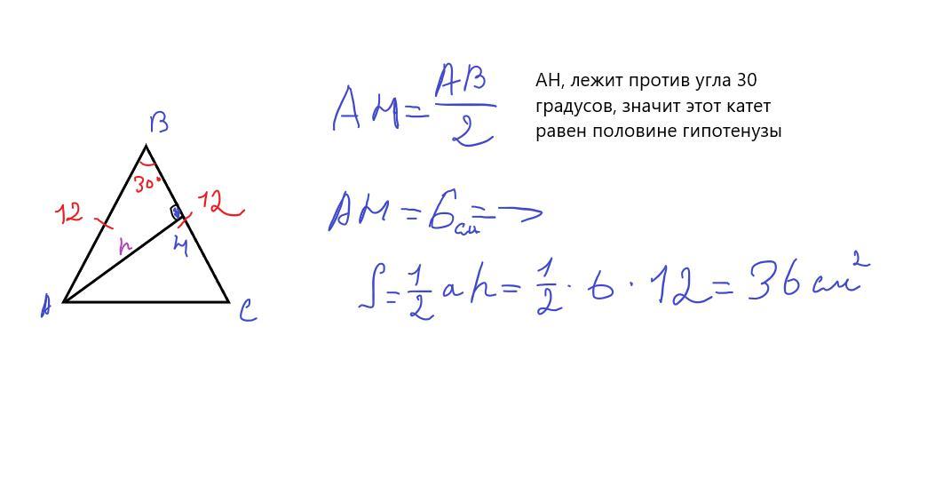 Найти площадь равнобедренного треугольника со сторонами 12 см, углом возвышения 30° pojalista..