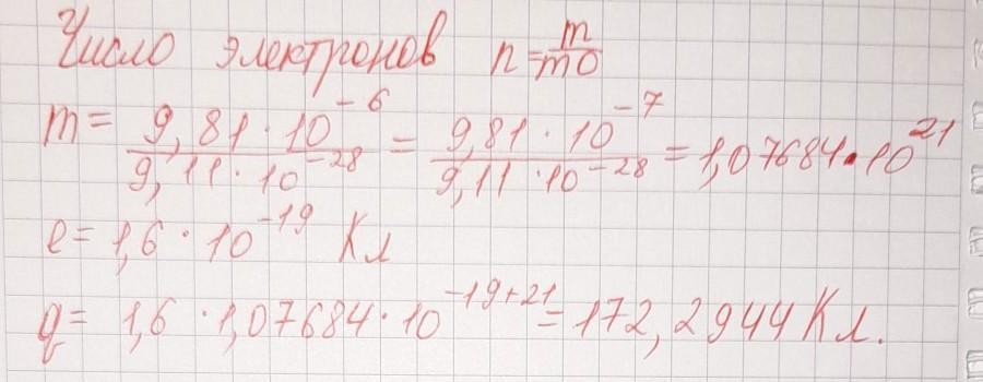 Если при зарядке капельки воды её масса увеличилась на m=9,81⋅10−6 г, то чему стал равен заряд капли? Масса одного электрона m0=9,11⋅10−31 кг.