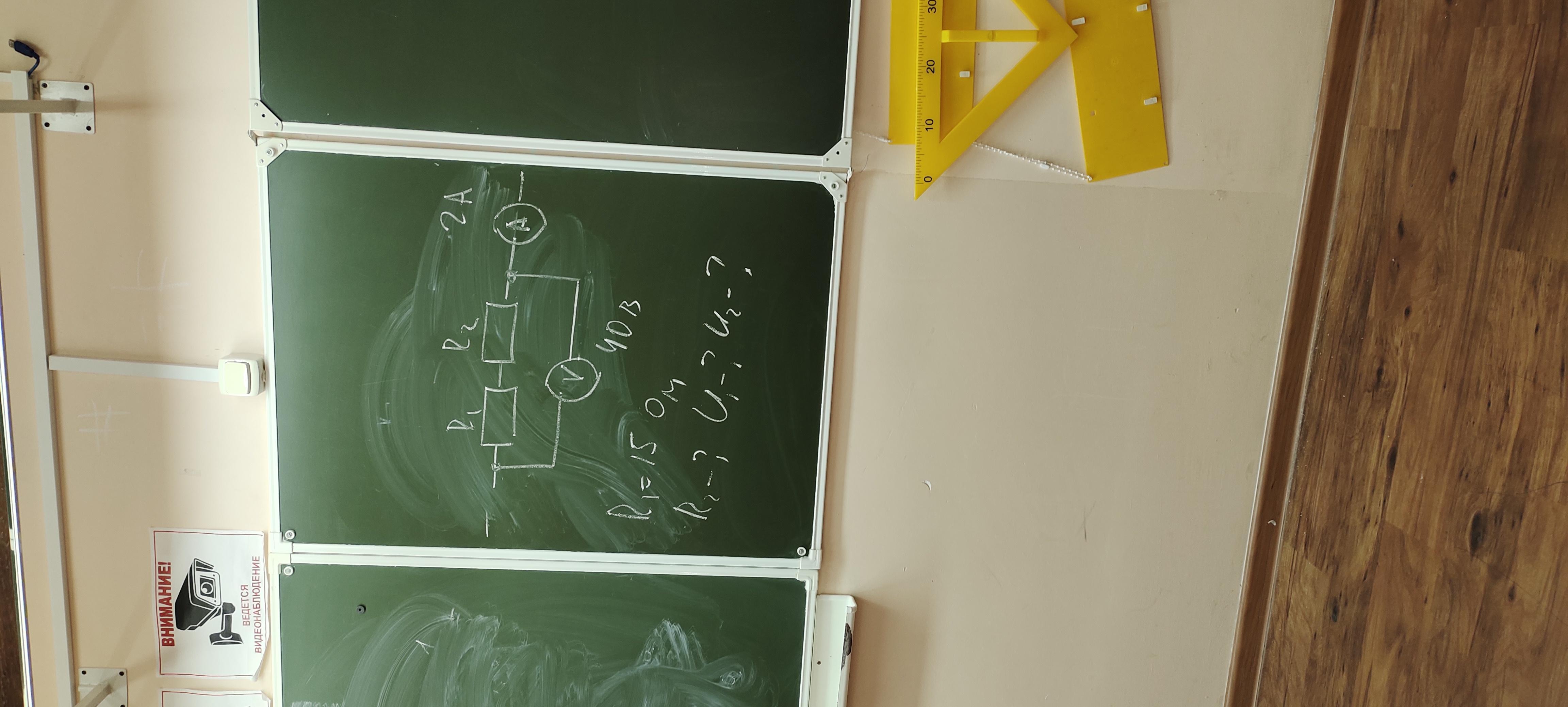 Возможно, ты ошибся, но данная цепь последовательная. Так как I=I1=I2=U/(R1+R2), получим: 2=40/(15+R2) => R2 = 5 Ом; U=IR => U1=IR1=30В, U2=IR2=10В