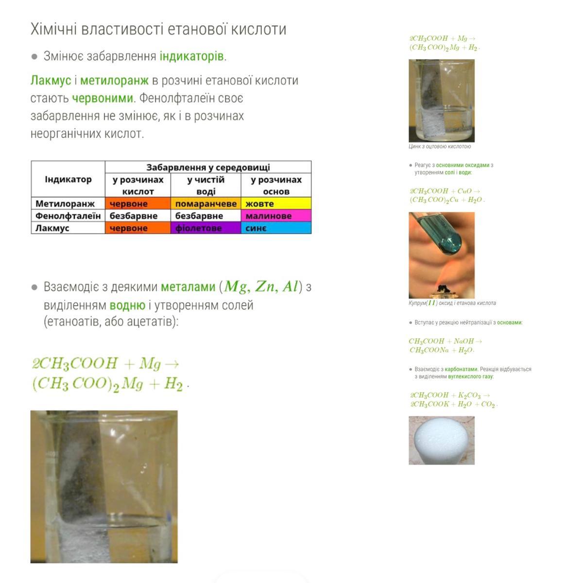 Оцтова кислота за стандартного стану є безбарвною рідиною із різким запахом. При замерзанні, за температури 16,635 °С, вона перетворюється на прозорі кристали (льодяна оцтова кислота).